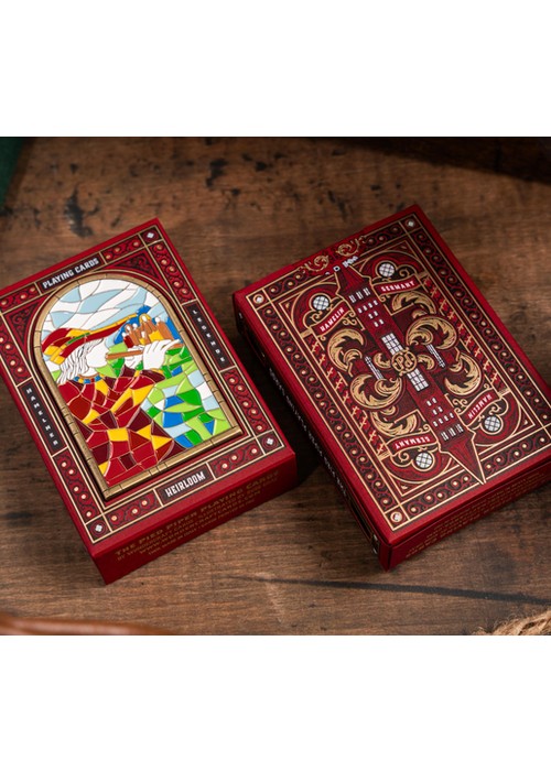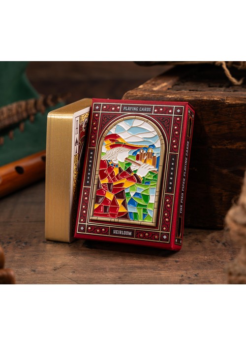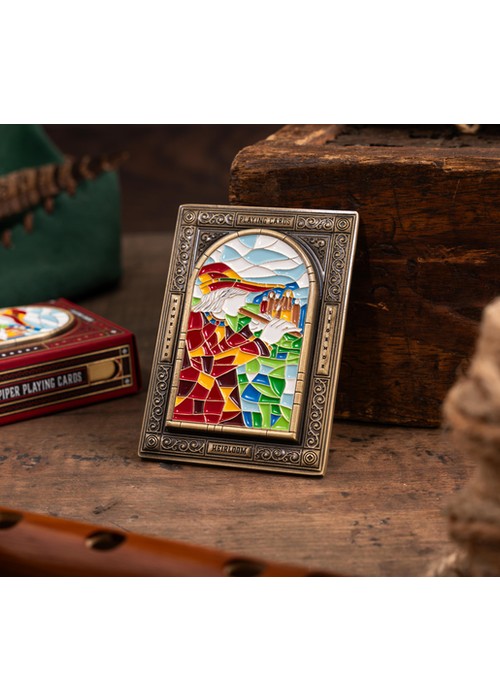 The Heirloom Legacy Edition features gold gilding and comes in a custom tuck box designed to showcase its details. Side cutouts allow the gilded edges to be visible even when the deck is inside, while a front cutout reveals the highlight of this edition—a two-sided metal card. This metal card weighs 5.6 ounces (heavier than a deck of cards) and includes a detailed stained-glass window replica on the front, paying tribute to one of the earliest known depictions of the Pied Piper story. It is a lasting piece meant to preserve the story’s history, just as the original stained-glass window did for generations.