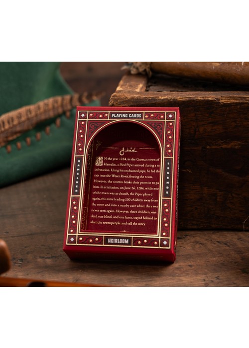 The Heirloom Legacy Edition is the most carefully crafted edition of the Pied Piper Playing Cards, designed with collectors in mind. This edition builds on the Heirloom Edition’s deep red and gold design, adding details that highlight the historical significance of the Market Church of St. Nicolai and its role in the legend.