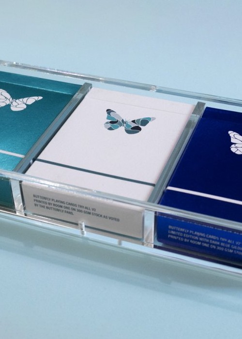 In 2025, we released the Butterfly Try-All Set in collaboration with Room One. A set of three identical-looking decks printed on different stocks, with one goal. To find out the preferences of card enthusiasts.