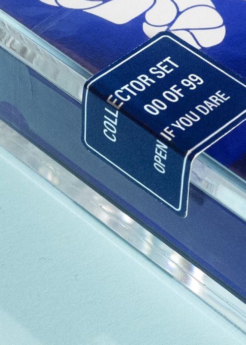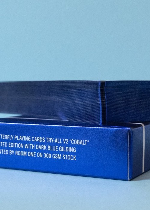 The Cobalt Variant has the matte fully-foiled box in cobalt foil with white matte spot foil for the circle and the butterflies. The cards are gilded in cobalt foil. The deck is bundled together in a 3-deck set inside a sealed acrylic case.