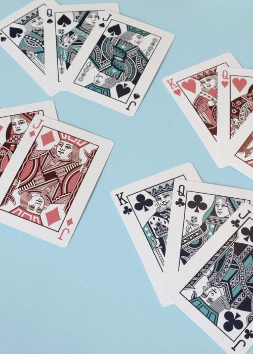We have covered the faces in a custom color scheme to match the back design and complete the deck’s look. Spades and Clubs are very dark blue, and Hearts and Diamonds are light pink.