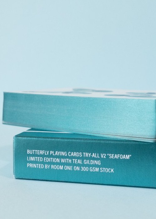 The Seafoam Variant has the matte fully-foiled box in seafoam foil with white matte spot foil for the circle and the butterflies. The cards are gilded in seafoam foil. The deck is bundled together in a 3-deck set inside a sealed acrylic case.