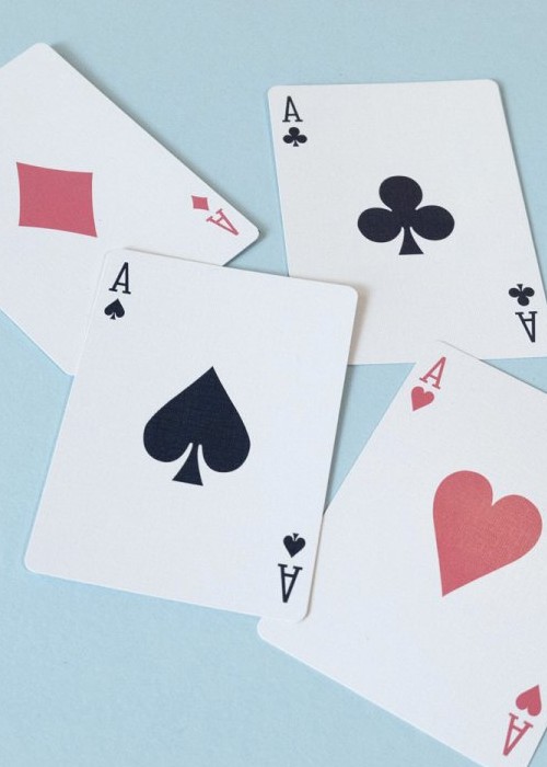 We have covered the faces in a custom color scheme to match the back design and complete the deck’s look. Spades and Clubs are very dark blue, and Hearts and Diamonds are light pink.