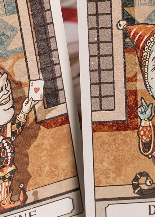 Designed for both play and divination, the deck unfolds a silent story of deception, desire, ambition, and judgment—enhanced by four special Jokers representing the forces of fate: Madness, Fortune, Misfortune, and Disguise.