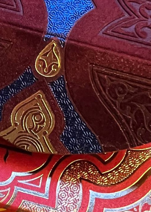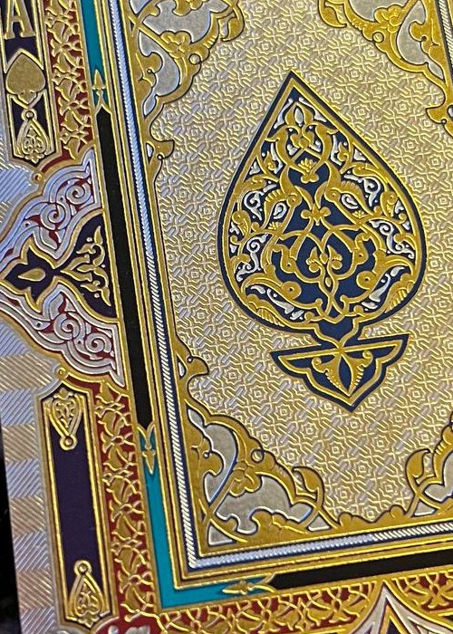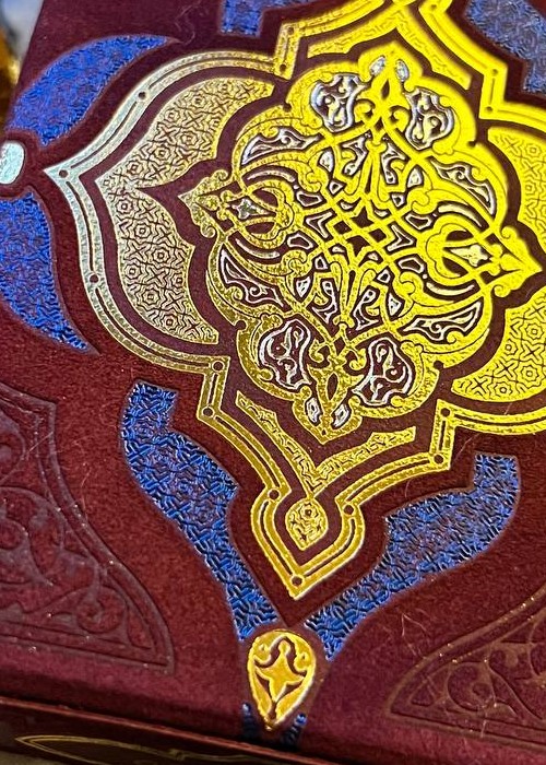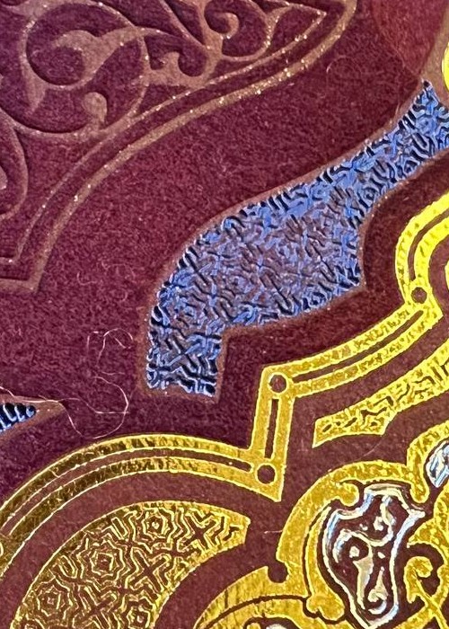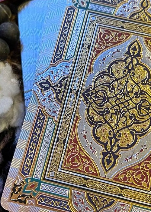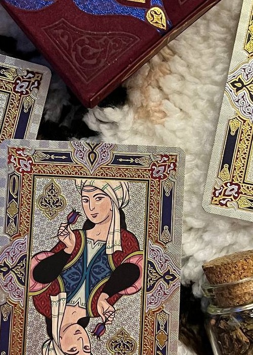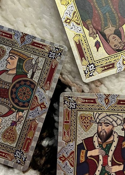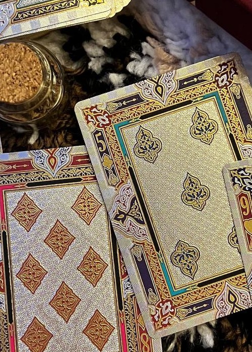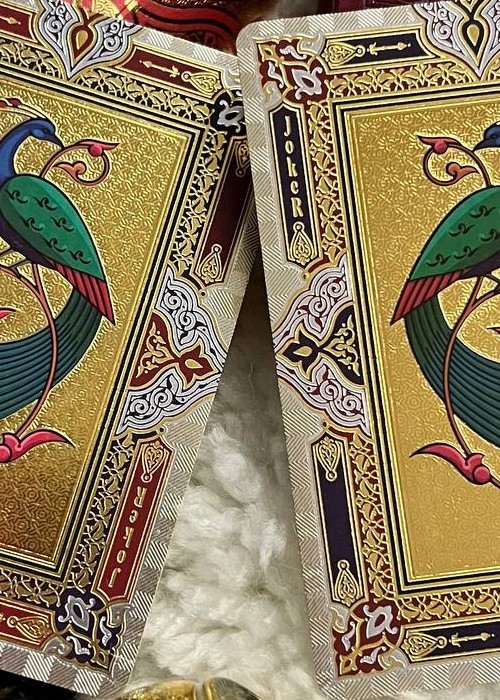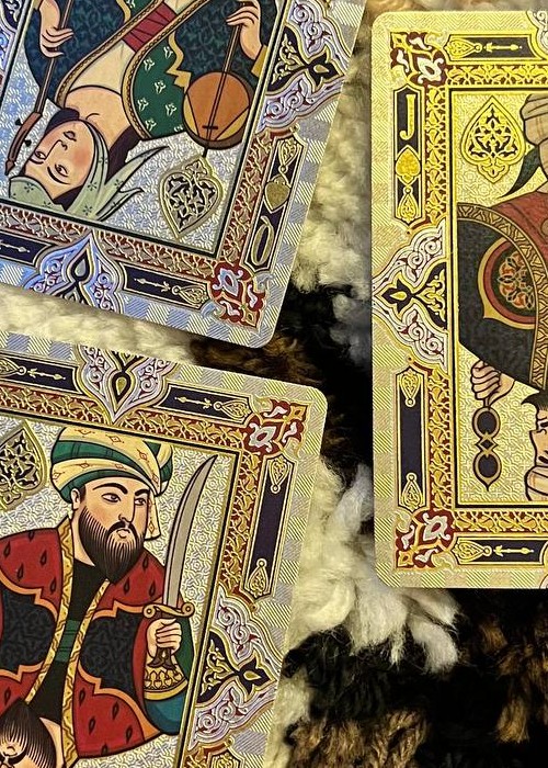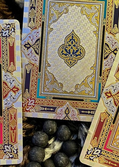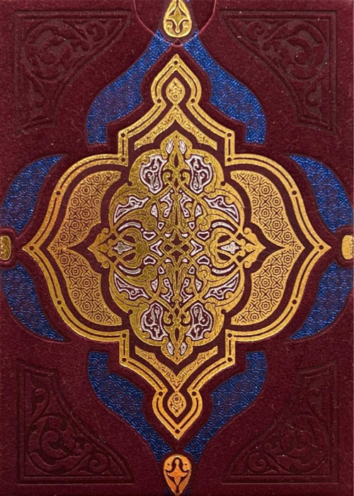 The deck is based on Persian Art and the mystifying yet beautiful collection of poems written by The Astronomer-Poet of Persia Omar Khayyam. The box is a velvet covered stock with debossed filligree and hot foiled details. Every box is hand numbered on the bottom, and it comes with a gold cardstock sleeve with the artist’s signature. All the cards are hot foiled on top of CMYK print.