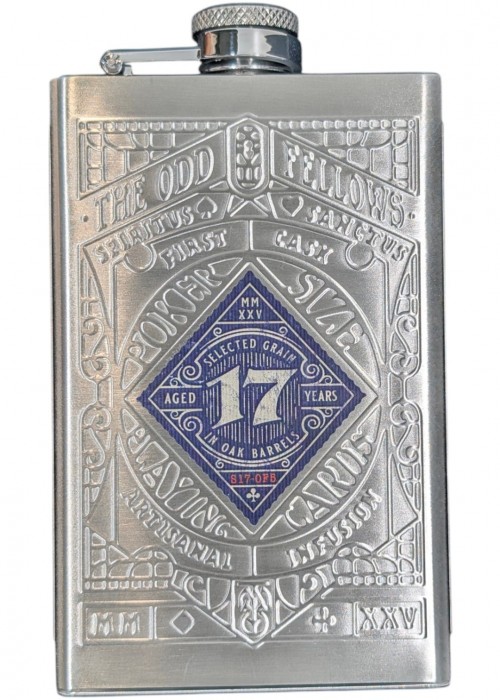 Sister Merry Gorda features blue color scheme of the back design. The cards are gilded with Cornflower Blue foil. The hip flask case is made of stainless steel with silver finish.