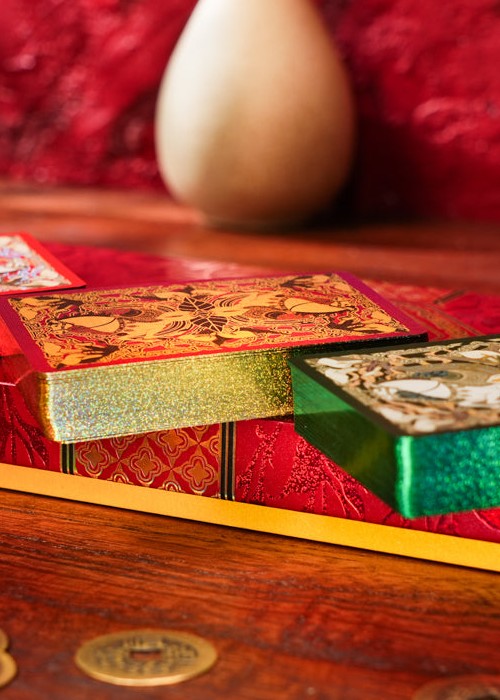 Gilded gold meets vibrant red in a version exclusive to the gift box, with extensive foil stamping that radiates a warm luster as light and shadow play across its surface.