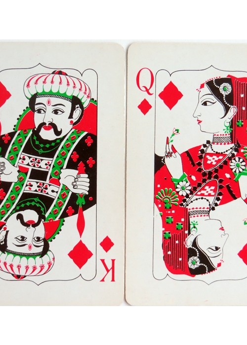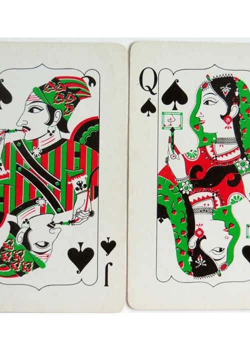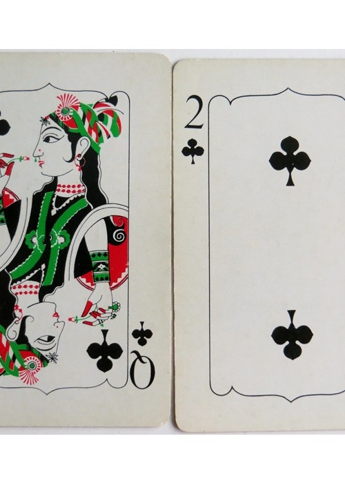 From ‘The World of Playing Cards’ : Special ‘Air India’ playing cards with non-standard courts in Indian attire and four decorative aces, made in India by Playwell Playing Card Co., c.1980. Playing cards were once a part of inflight complimentary items, especially on long haul flights, but are becoming rare due to cost cutting and now a part of aviation collectables. Although using only red, green and black the cards are very bold and vibrant.