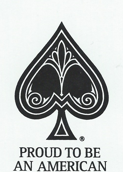Poker 359 by United States Playing Card Company, 1993, Cincinnati, Ohio. Card back has Proud to be an American printed on back. Custom Ace of Spades, standard faces.