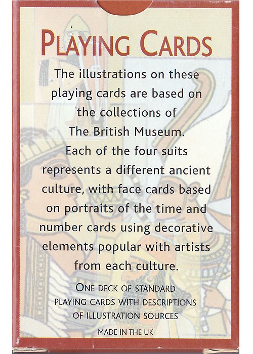 From insert included with the deck: The illustrations for these playing cards are all derived from exhibits in the collections of the British Museum. Clubs depict images from Ancient Egypt, Spades from the Assyrians, Hearts from Ancient Greece, and Diamonds from various Medieval sources. The pips have been modified slightly with iconographic designs (same for each suit) relevant to the associated ancient culture.
