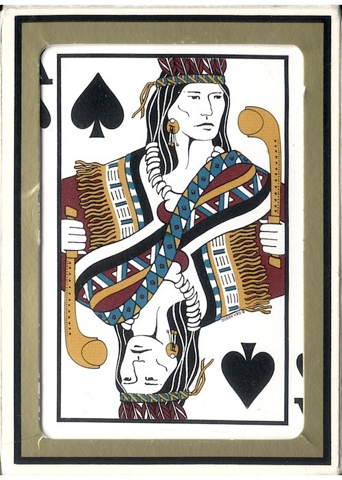 Arrowhead – printed by Gemaco for Casino Regina The Arrowhead deck was originally printed by Gemaco in 1995, under license of the Benjamin Greenfield Corporation, and has been used by many First Nations casinos. The artwork is by G & H Assoc. for Mystic Chips of Mystic, Connecticut and the deck consists of 52 cards, 2 jokers and an information card. Each court card graphically illustrates the appearance of one of many First Nations from throughout North America, while also using the correct head, hand, and staff or weapon positions found in traditional playing cards. Each suit is dedicated to, and based upon, a particular region’s Nations: Spades: – Northwestern Algonquian Diamonds – Great Plains Clubs – Northwestern or Great Basin Hearts – Southwestern The jokers blend coyote, fox and wolf.