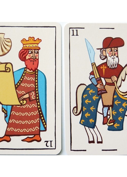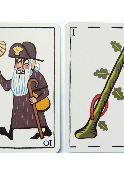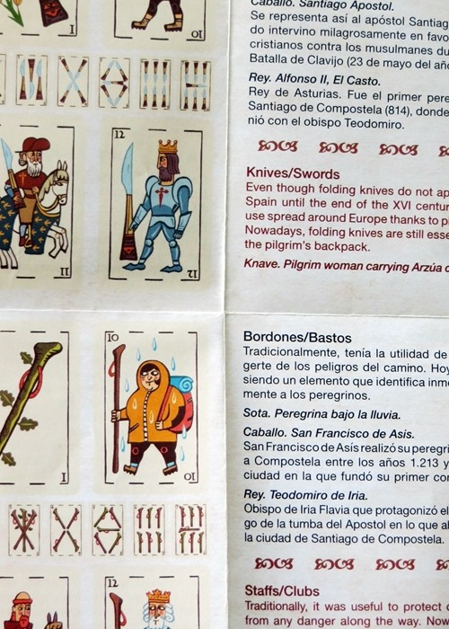 Also called the Saint James’ Way’s Cards. The pack is inspired by historical figures who have walked this route. The four suits are Gourds/Cups, Scallop Shells/Golds, Knives/Swords, and Staffs/Clubs. The link, with more explanation about the cards is at https://www.ideasperegrinas.es/en/card-game/