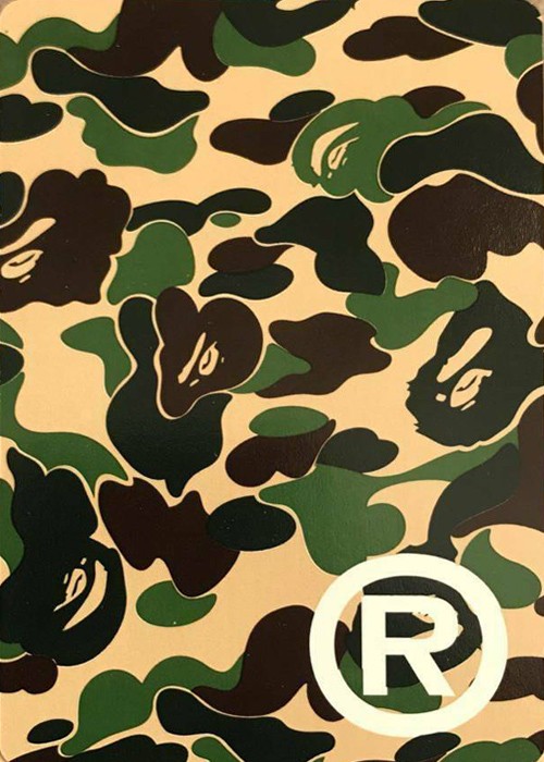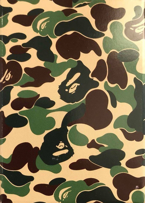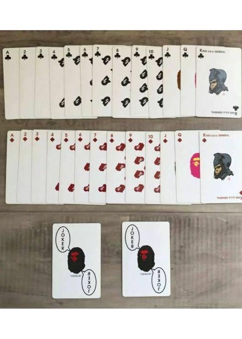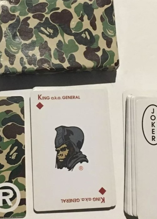 Bathing Ape Camo Edition Playing Cards. This Bape deck features a camo pattern back hiding the ape face within the pattern. May possibly come in both bridge and poker size.