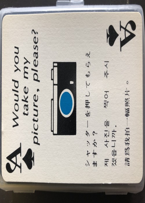 A souvenir travel deck that features English written questions on top and Korean, Japanese, and Chinese translations on the bottom of the card faces. This deck was produced mainly as a translation deck.