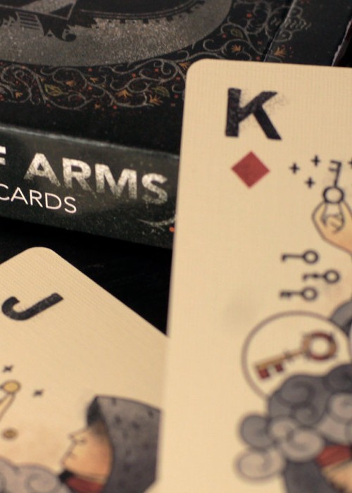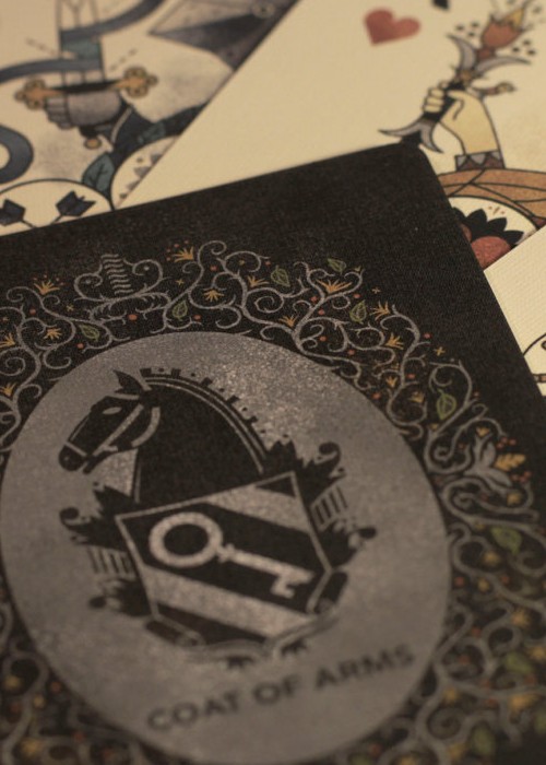 Discover your favorite house: The Royals, Mariners, Bandits or Knights. These poker-size (2.5×3.5) playing cards are printed on high quality, plastic-coated, linen card stock and encased in a custom tuck box. The deck includes 54 uniquely illustrated cards (two through Ace – – along with two Jokers). The design on the back features a Belgian horse’s head and a crest adorned by flowered vines. As if they have seen hundreds of games already, these cards appear aged in their design but fresh and crisp in their quality.