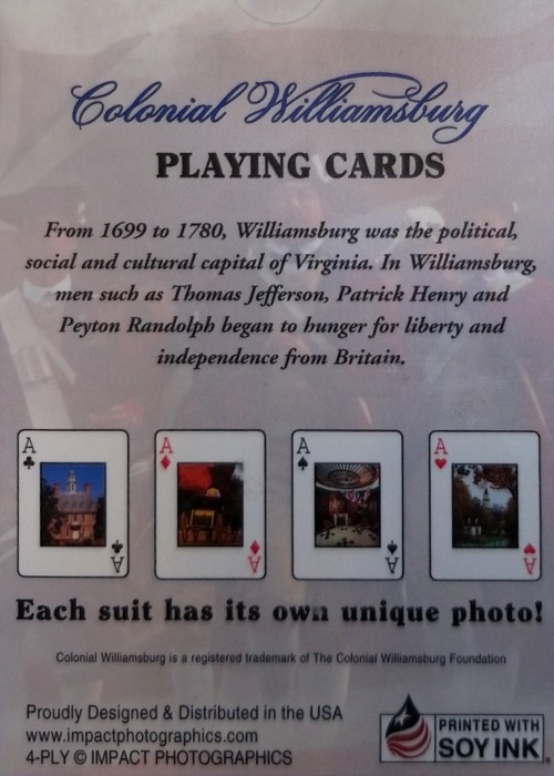 Souvenir playing cards from Colonial Williamsburg with unique photos on each card.