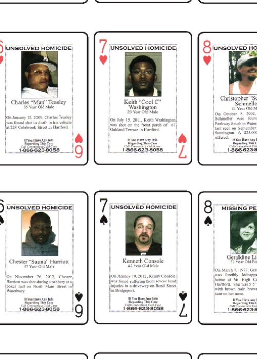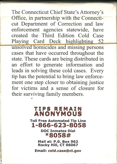 Includes photographs and descriptions for victims of cold cases in Connecticut. Distributed through the prison system to promote awareness of the unsolved cases. The Connecticut Division of Criminal Justice in partnership with the Connecticut Department of Correction and law enforcement agencies statewide have created a Cold Case playing card deck highlighting 52 unsolved homicides, missing persons, and unidentified remains cases that have occurred throughout the state. These cards are being distributed in an effort to generate information and leads in solving these cold cases. Every tip has the potential of bringing law enforcement one step closer to obtaining justice for victims and a sense of closure for their surviving family members. Edition Numbers are printed on the side of the truck case, as well at on the bottom front of the truck case. The original version 1 (blue), has no edition number printed on the tuck.