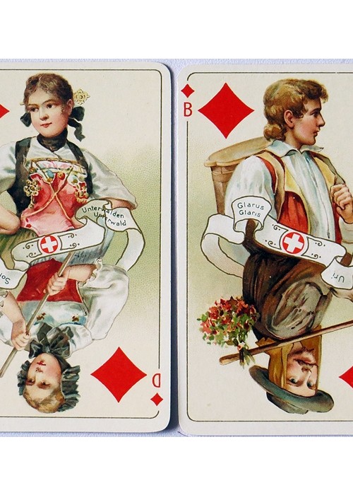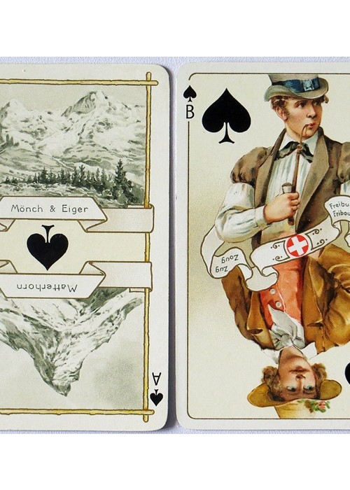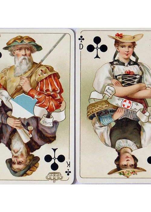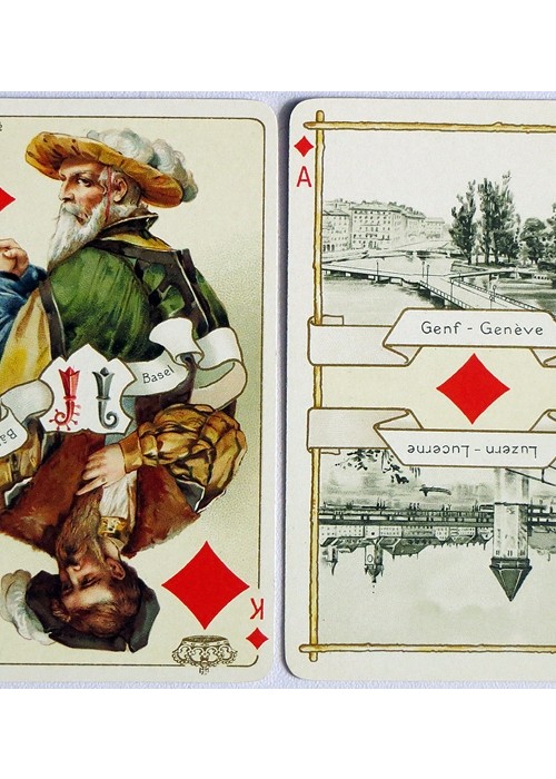 From ‘The World of Playing Cards’ : Schweizer Trachten Whist No.174 (Swiss Costumes) printed by Dondorf, featuring scenic aces and traditional costumes with different views at each end. Various editions of this deck were published in chromolithography, with alternative back designs, between 1906-1933. The jacks and queens show young men and women wearing costumes of individual cantons. The four kings, with flowing beards and crowns above their suit signs, are senior officials from the four Swiss cities of Zurich, Geneva, Bern and Basel. The labels are on wavy banners, except on the aces they are angular.