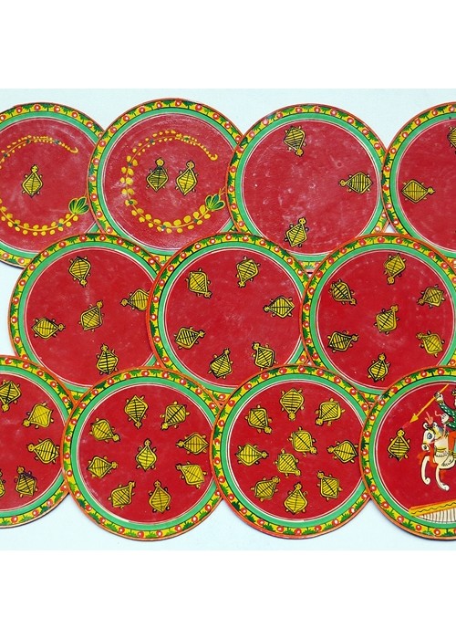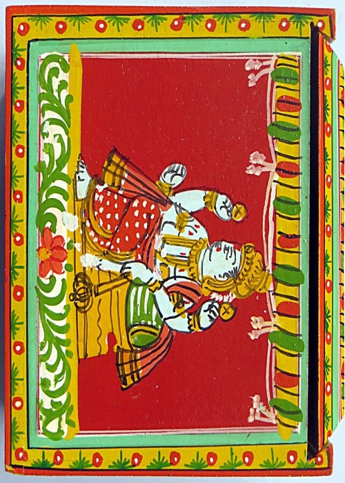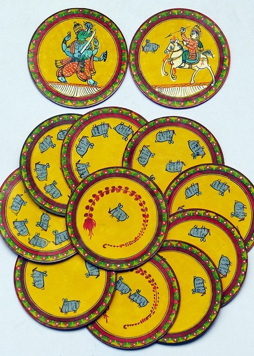 120 handpainted (?) cards (10 suits : 12 cards in each suit) in wooden box, with some description of the cards, and rules for the game. The suits are Fish, Turtles, Boars, Lions, Vessels, Axes, Arrows, Plates, Shells, and Swords.