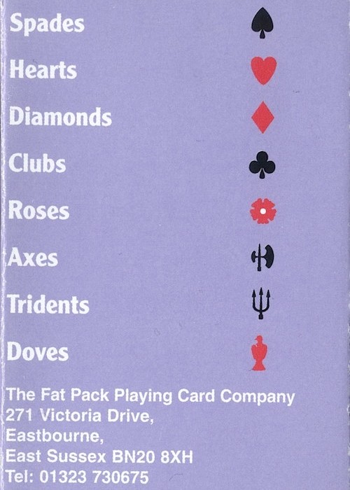 An enlargement of the traditional pack of playing cards, with the addition of four new, inferior suits, two black and two red, designated in descending order of value: Roses, Axes, Tridents and Doves.
