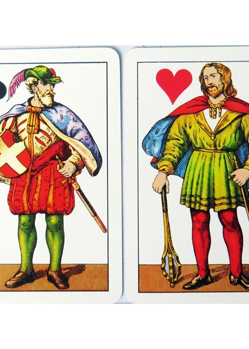 Standard Italian Florentine pattern with 40 cards. From the’World of Playing Cards’: One of several similar designs which emerged during the nineteenth century, the French-suited, single-figured, large-format Florentine pattern has several distinctive features. The courts are realistically drawn without formalised style, and are dressed in Renaissance costume. The king of diamonds is reading a scroll; the jack of clubs is holding a large book; the queen of hearts is holding a letter, or about to drop it. There are no indices, usually 40 cards.