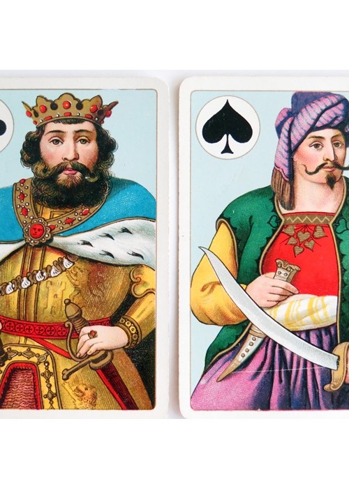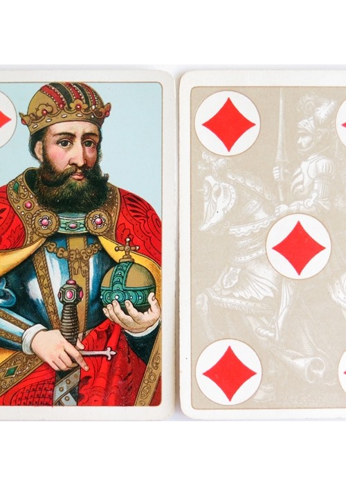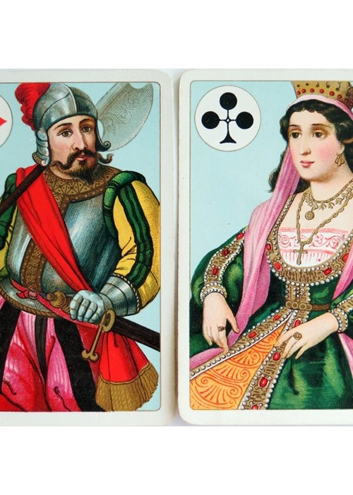 Dondorf’s “Luxus-Spielkarte Vier-Erdteile”,(“Four Continents”) c.1880-1906. First published in c.1870, it has been re-published in several editions, variations and formats since then. Some were published after 1906, when the firm was re-named Dondorf GmBH. Earlier editions had square corners whilst the later editions had rounded corners. The court cards are dressed in the garb of their corresponding part of the world, as represented by the Four Aces: Spades show a Sultan, his wife and a Janissary (sultan’s household troops or bodyguards). Hearts portray a Great Mogul, an Indian princess and an Indian warrior; the suit of clubs depicts the Spanish King Ferdinand, Queen Isabella and a Spanish ambassador. Diamonds illustrate the Emperor, the Empress and a mercenary soldier.