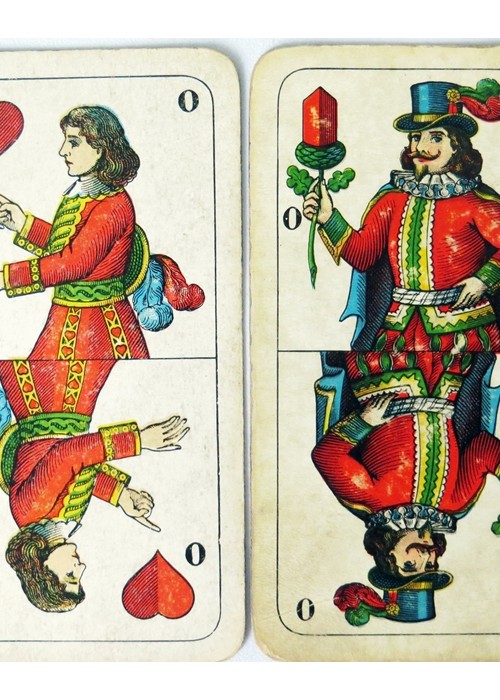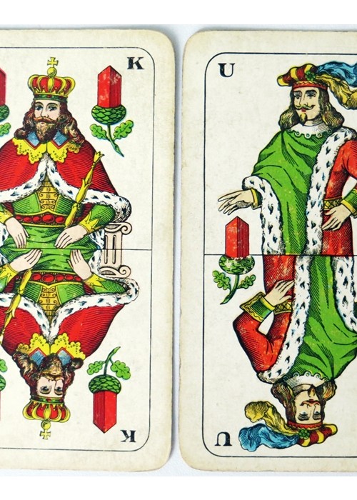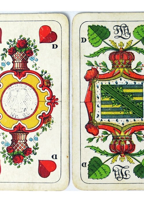Standard German Saxon Pattern, with Germanic suits (leaves, acorns, hearts and bells) and German Indeces (D K O U). The cards are double headed, and this pack probably dates to the early 20th century. The designs for the Saxon pattern probably originated in the 18th century, making it one of the older German-suited patterns. The Saxony coat-of-arms appears on the daus of acorns (under a lion’s head) and on the daus of leaves.