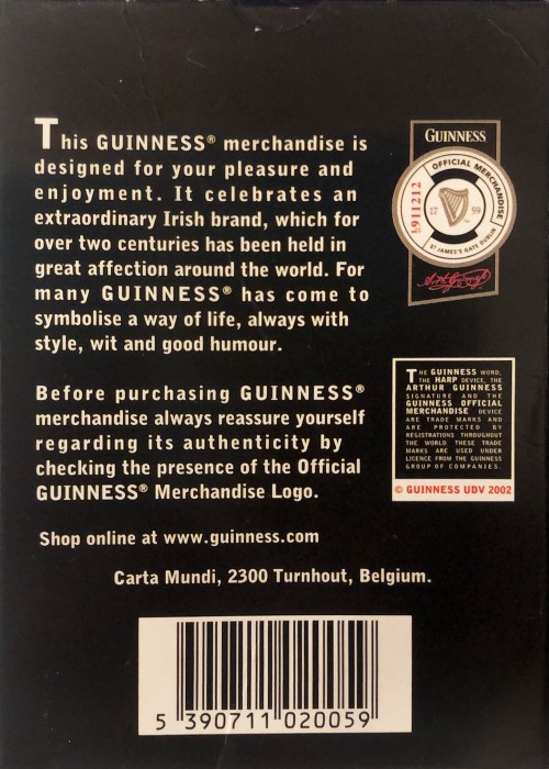 A promotional deck for Guinness beer. It is slightly larger than a poker deck. The faces are standard, and the finish is smooth. The backs are one-way.