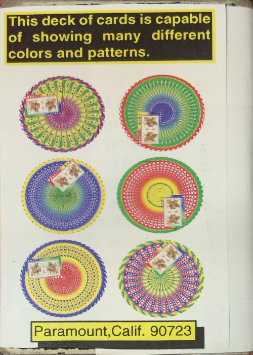 This is a specially printed deck designed to make eight different fanning patterns. The cards are slightly thinner than regular cards, to make them easier to handle and manipulate. You’ll get a deck of cards with regular faces on one side, and a colourful back on the other. Depending on which direction the cards are fanned, and which order they are in, when fanned out the cards will create eight different colourful patterns. You’ll even get a few special cards that, when placed on the deck, completely change the pattern, or make the faces of the deck seem to vanish. The effect is that even though you are only using ONE deck, it looks like you are able to change the back patterns on the cards, multiple times! This deck was designed and marketed by the late actor and magician Harry Anderson. The deck features an illustration of Harry as his Harry the Hat con man character that he made popular in the 1980s on the sitcom Cheers. The photos are a paper wrapper around a plain black box with a grey lid. The back of the cards is like the front of the paper wrapper. The back of the wrapper shows all the possible fanning patterns.