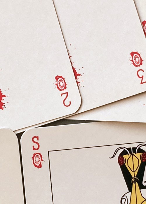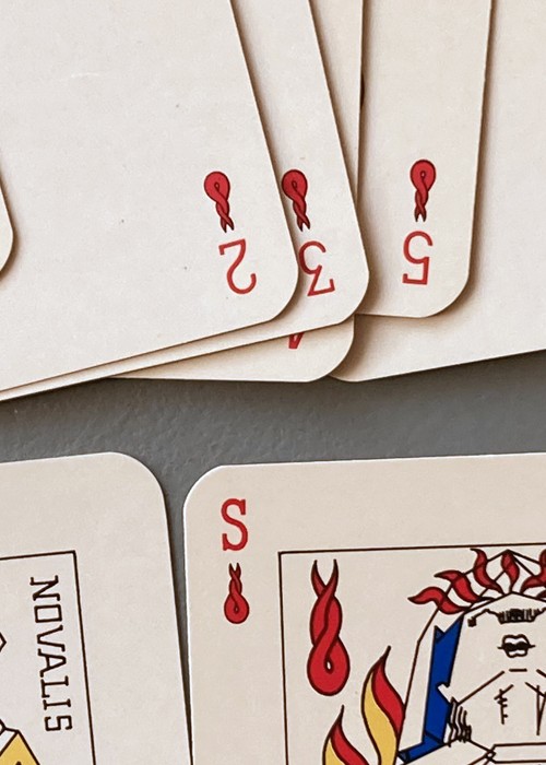 In the 1940s André Breton and a group of his Surrealist friends (Wifredo Lam, Max Ernst, Jacqueline Lamba, Oscar Dominguez, Victor Brauner, Jacques Hérold, André Masson and Frédéric Delanglade) were stranded in the French port of Marseilles whilst attempting to escape Nazi-occupied Europe and gain passage to America. Having deconstructed traditional, bourgeois playing card symbolism they produced new, liberated designs expressing their own beliefs and values. The court cards were persons representing new, revolutionary ideals. As Breton was a Communist, the conventional court hierarchy denoting military power and rank was unacceptable: these were re-named Genius, Siren and Magus… Having deconstructed traditional playing card designs, Breton wanted a thorough reinvention along Surrealist principles. The suits were renamed: Locks (black) for knowledge, Wheels (red) for revolution, Stars (black) for dreams and Flames (red) for love and desire. Surrealist ideas inspired many young artists to move away from conventional views of artistic composition towards abstract expressionism. The “Jeu de Marseille” was eventually produced as a full deck of cards (with the original sketches being reworked slightly) in 1983 and has been reprinted several times. From: https://www.wopc.co.uk/france/grimaud/le-jeu-de-marseille