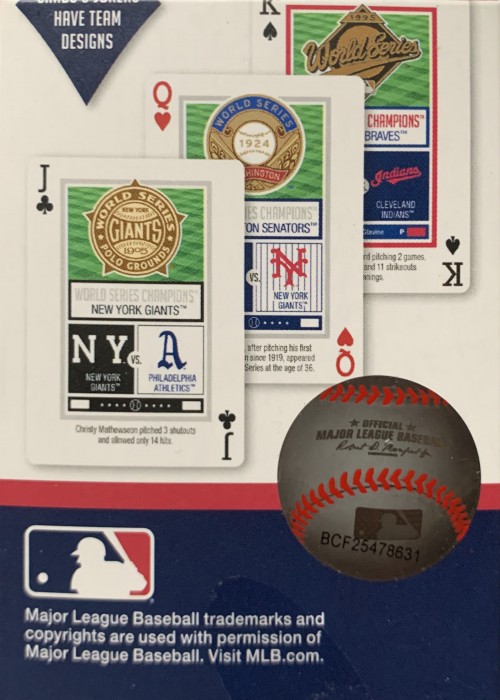 The standard deck contains 52 cards and 2 jokers with each card featuring a World Series from the past with the teams, the final score, MVP and location. All Face Cards and Jokers have individualized Team Designs. Ace of Spades has Special Wood Cut Baseball Design and World Series Trophy.