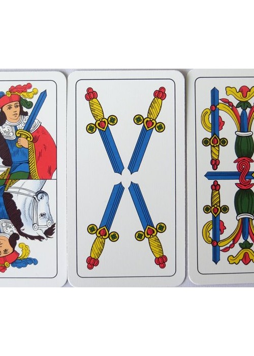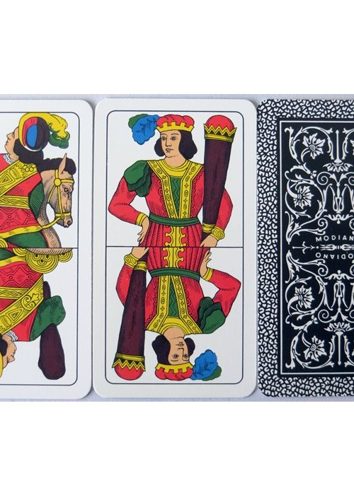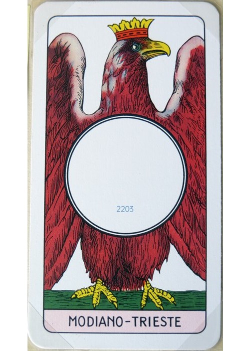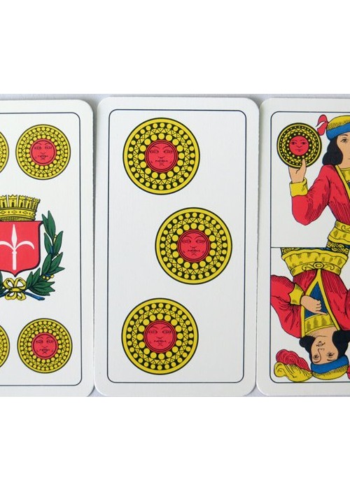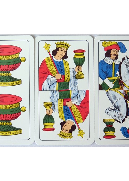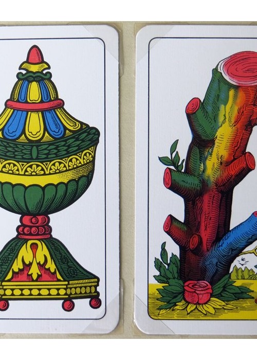 Italian Regional Pattern. From ‘The World of Playing Cards’ : The Italian ‘Piacentine’ pattern has Italo-Spanish suit symbols and slightly narrow, elongated cards. It was made in single-ended format until around the mid-20th century after which time double-ended versions are more usual. When this happens some features of the old cards are lost. The Ace of Coins used to bear the tax stamp, and shows a single-headed, crowned eagle (as opposed to the Neapolitan double-headed eagle). Cards of Spanish design occur in those parts of Italy formerly under Spanish influence (Neapolitan, Piacentine, Romagnole, Sardinian and Sicilian patterns) although the ‘pintas’ or line-breaks in the outer frames have been lost. Early examples of the Piacentine pattern also have features related to French Aluette cards.