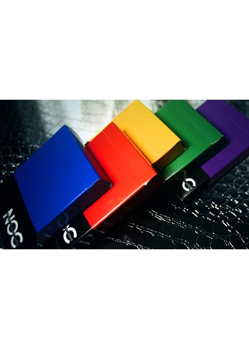 The V1 are regular decks with a thick black bottom Bordered and the words minimal playing cards located in the NOC are written in the colour of the deck. They come in red, yellow, green, blue, and purple.
