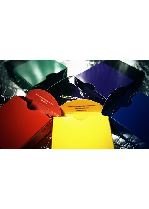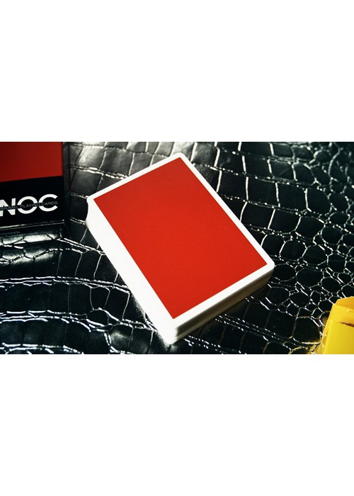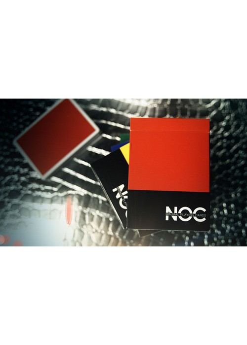 The V1 are regular decks with a thick black bottom Bordered and the words minimal playing cards located in the NOC are written in the colour of the deck. They come in red, yellow, green, blue, and purple.