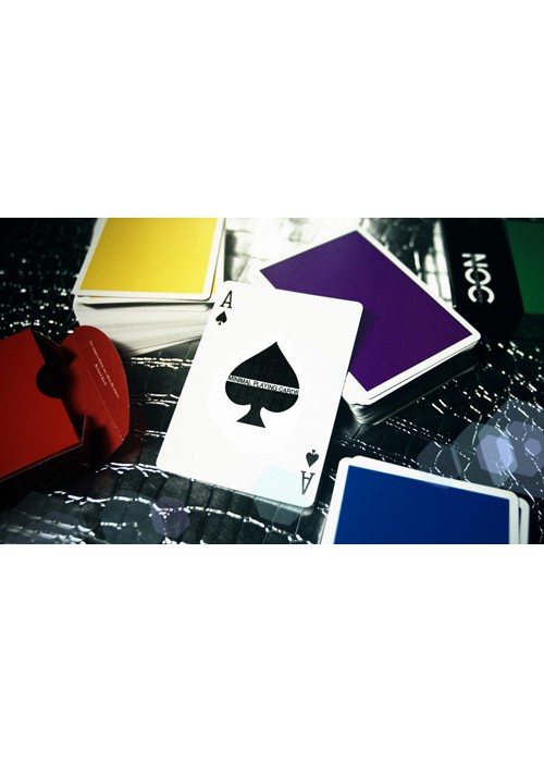 The V1 are regular decks with a thick black bottom Bordered and the words minimal playing cards located in the NOC are written in the colour of the deck. They come in red, yellow, green, blue, and purple.