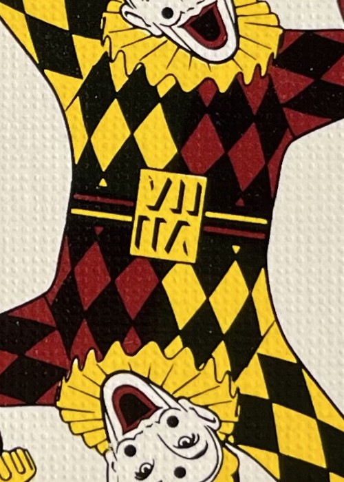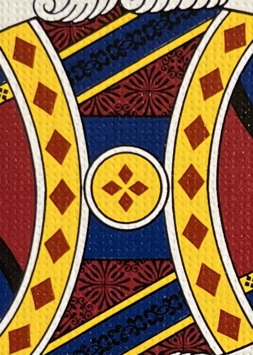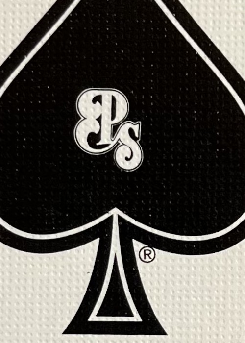 Paulson deck used during live play at the Silver Dollar Casino in Sea-Tac, WA. The deck was marked with black ink on the upper left and lower right corners, and a half circle notch was punched on each long side of the deck. Pips are jumbo for vision impaired.