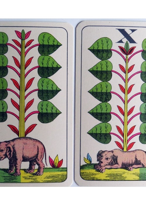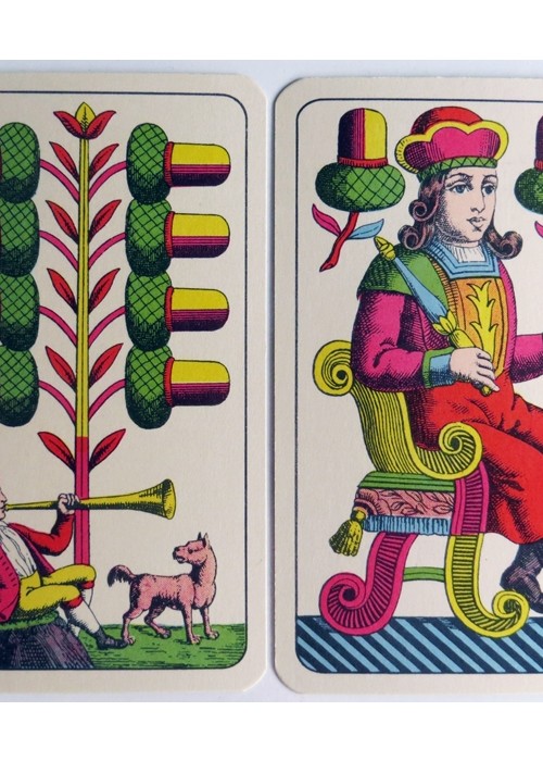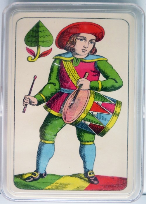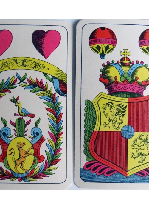 Extract from ‘World of Playing Cards’ : Cards from the area which was formerly the Austro-Hungarian Empire are immensely varied. Some of them have special regional differences and are named accordingly. Just as regional dialects are spoken within different areas, similarly, regional styles of playing cards follow the fashion for certain games, ethnic groups or social classes. The Bohemian pattern, also known as the Prager pattern, shares similarities with other old German-suited patterns, such as the Bavarian and Franconian, and preserves details which have survived from the earliest days of German cardmaking, such as soldiers holding weapons and animal or burlesque vignettes on the numeral cards.