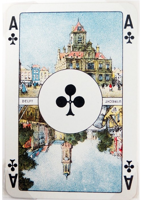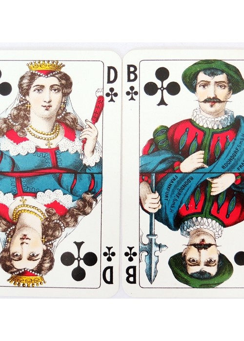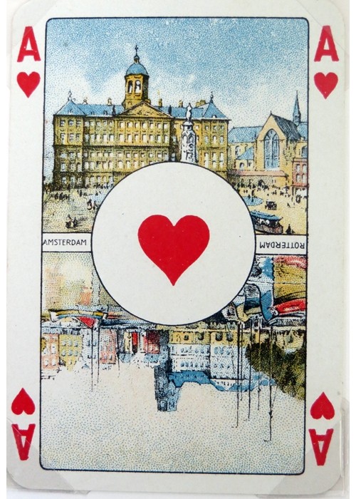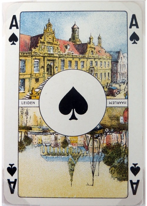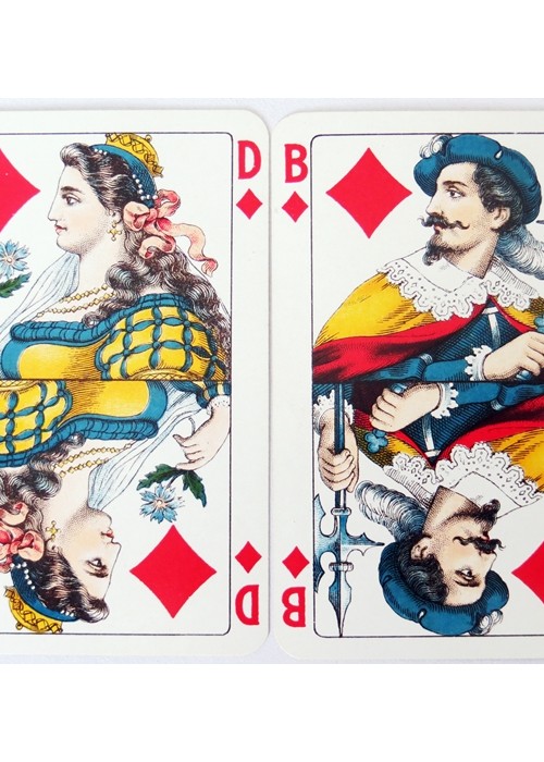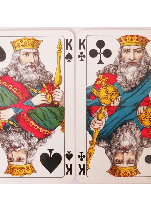 From the ‘World of Playing Cards’ : This pack was probably the culmination of a mixture of designs from 19th century Germany which emerged as one of Dondorf’s more popular house patterns by around 1900. The four Kings each have white wavy hair and beards, giving rise to the nickname “Jewish Pattern”. Its popularity was increased by its being widely used and copied by Austrian, Belgian, Dutch, Polish, Portuguese and other manufacturers, some of whom created new variants. Some versions have scenic Aces (historical or geographical) which vary from pack to pack; others have plain Aces. The pattern continued to be produced after the takeover by V.A.S.S. in 1933.