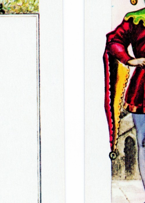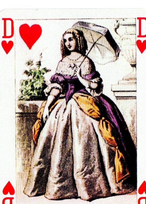 A deck of 52 + 2 jokers presented a reproduction of original first edition. Costume playing cards became very fashionable in France during the 19th century. This beautifully engraved and pleasing historical deck designed in 1856 has French Kings and consorts as the Kings and Queens, with court attendants as the Jacks, all dressed in magnificent period costumes from their respective eras. This cards are engraved, hand-coloured, gilded corners, manufactured by B.P.Grimaud, Paris, c.1856 and reprinted c.1891. Now we have a recent reproduction maked by the J.M. Simon from The Grimaud editions. The exact size of the deck is 88 mm x 64mm.