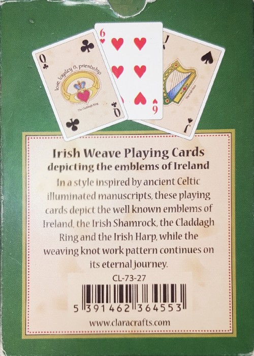 These playing cards are part of the Irish Weave Collection. They depict the Emblems of Ireland, in a style inspired by ancient Celtic illuminated manuscripts, these playing cards depict the well known emblems of Ireland, the Irish Shamrock, the Claddagh Ring and the Irish Harp while the weaving knot work pattern continues on its eternal journey.