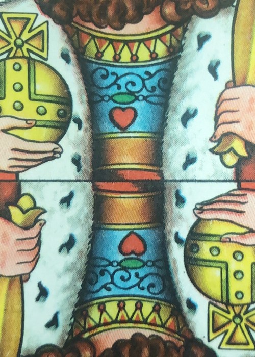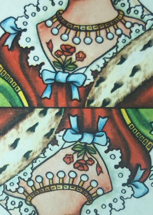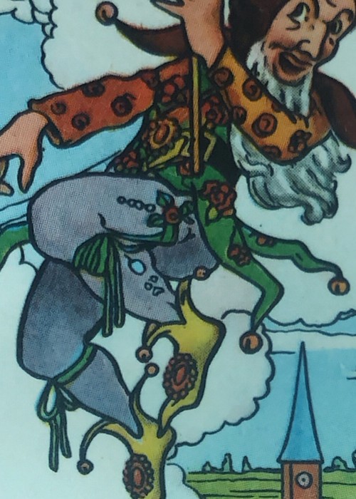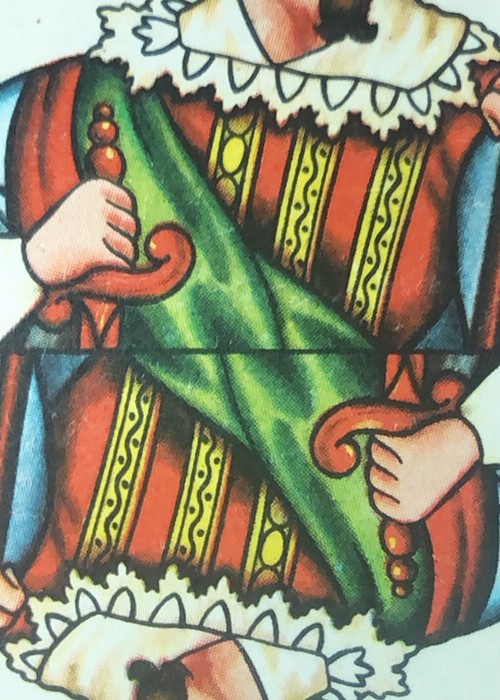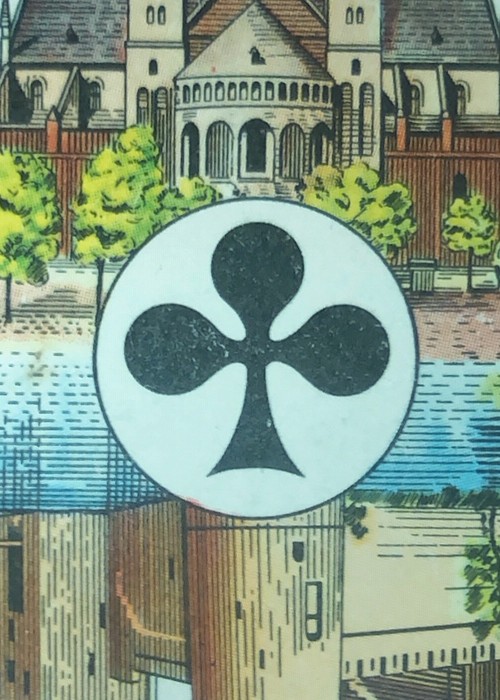 Vintage cards from Holland. II have included more photos of individual cards in the gallery. The court cards are full colour artwork with indices of B for Jack; V for Queen; and H for king. The aces each show two important buildings of cities of the Netherlands, one facing one way, and the other facing the opposite way. There are also full colour. The photos in the gallery show the pips for each suit. The jokers are the same, and pictured below. There is an extra card showing bridge hands. The back of the cards is two-way as on the back of the tuck box, with Bordereds. The flap tucks into the front of the box.