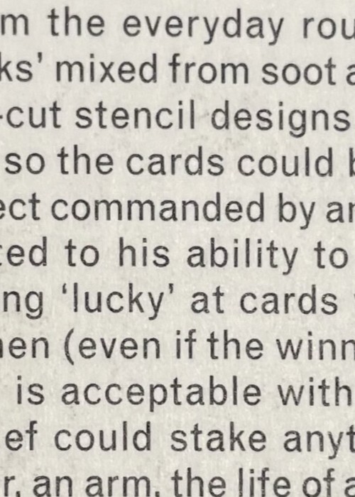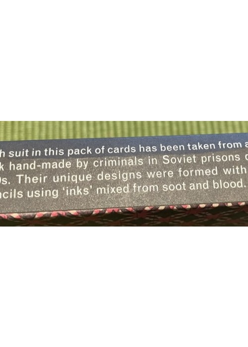 From the Publisher (https://fuel-design.com/publishing/): Each suit in this pack of cards has been taken from a different deck hand-made by criminals in Soviet prisons during the 1980s. Their unique designs were formed with hand-cut stencils using ‘inks’ mixed from soot and blood. In Soviet prisons card playing was prohibited. Cards were constructed using everyday materials sourced from prison life. The respect commanded by any Russian criminal was directly related to his ability to play, and win, at cards. A thief could stake anything in a card game, a finger, an arm, the life of another inmate, or even his own. If he lost, the debt had to be paid immediately. The penalty for defaulting was expulsion, a forcibly applied tattoo or in some cases, death. Confiscated and destroyed by the authorities, original decks are difficult to obtain and often incomplete. The authentic designs reproduced here have been taken from original cards collected over the last ten years. More information about the cards here.