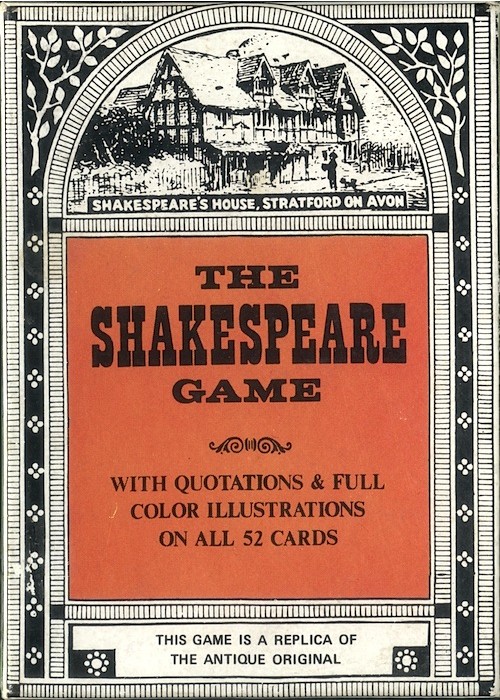 This reproduction printed in Hong Kong for Merrimack Publishing Corp. of New York. Originally printed by Fireside Game Co. which became Cincinnati Game Co. in 1900 (both USPCC). Includes leaflet explaining game play. Victorian game in which each of the 52 cards represents a scene from a Shakespeare play (with fabulous card art!) and has a quote from that play printed on it.