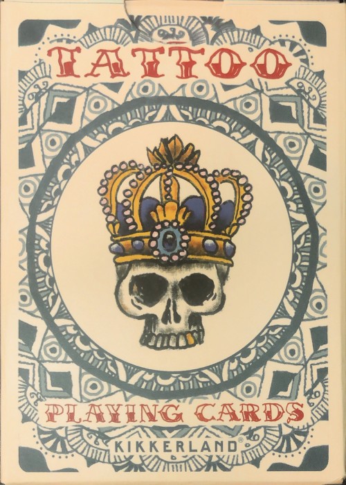 Every card has artwork of a tattoo. The aces are all different, but the other twelve cards with their different tattoos are the same in each suit (ex. twos are a pair of dice, threes are an angels with with a halo and a three, etc.). The tattoo pictures of the black suits are black, and the court card pictures are primarily blue, and the tattoos of the red suits are red, and the court card pictures are primarily red. The letters and numbers of the indices are stylised to look like a hand-done tattoo also. The backs are two-way, and have a mandala in blue, and Bordereds. The backgrounds of the fronts and backs is a very light pink/brown off-white. The jokers are identical and show the clown on the front of the tuck box, but with a plain background.