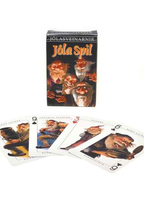 Playing cards depicting the Icelandic Yule Men, or Lads as interpreted by the artist Brian Pilkington. The story behind the Yule Lads, Grýla, Leppalúði and the Yule Cat: Yule is the English translation for the Icelandic word Jól, the original name for the ceremonies and celebrations of the winter solstice.