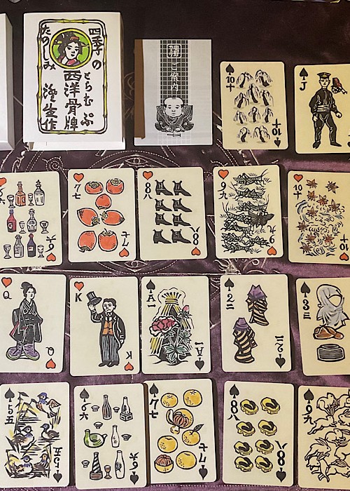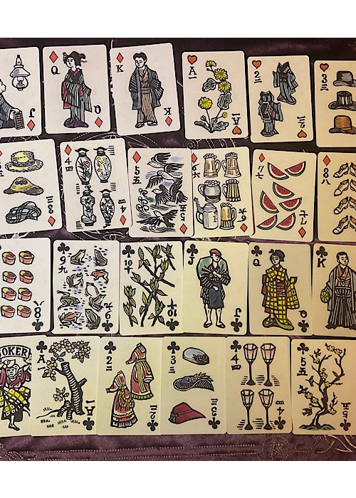This is the reprinted edition of a work of Sumio Kawakami, a Japanese woodblock artist, made in 1960. His sensitivity toward the changes of the seasons is brilliant. Each suit is assigned four seasons; for example, clubs are spring, diamonds are summer, hearts are fall, and spades are winter. Moreover, each number is assigned motifs too; for example, there are fruits on the card numbered 7, so diamond suit (summer) has bright red water melons, and hearts suit (fall) has persimmons. It’s certainly that you enjoy the passage of seasons when you play sevens. These playing cards make us feel nostalgic for the seasons which are the root of a Japanese sense of beauty.