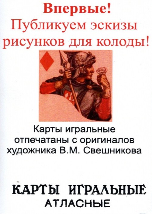 This is a special reprint of the Soviet playing cards with original designs by Viktor Sveshnikov based on the theme of Opera and Theatre scenes, first printed in 1974. It is also known as Opera & Theatre Scenes/На мотивы оперных сюжетов. This deck is 52 cards + 3 Jockers and 6 alternative for the Jacks, Queens and King of Heart. The Russian indices are: Ace – Туз, Jack – Валет, Queen – Дама, King – Король.