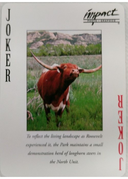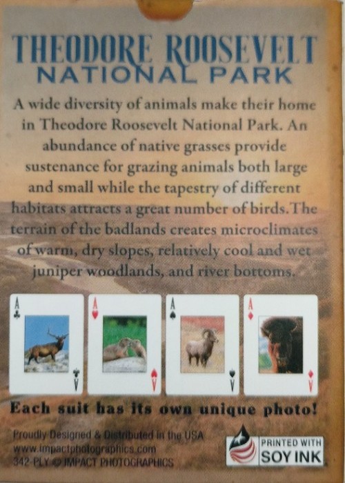 Theodore Roosevelt National Park, Impact Photographics. Features wildlife photography: spades have a bison, hearts have prairie dogs, clubs have elk, diamonds have big horn sheep. One joker has a feral horse, the other has a longhorn steer. No publication year on product.