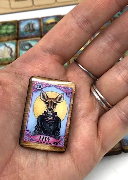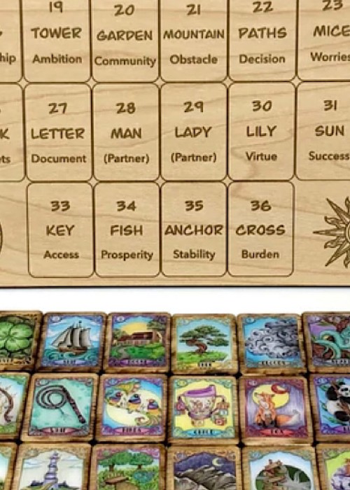 38 Sawyer’s Tiny Lenormand Tiles – complete Lenormand deck in tile format •Signifiers are 2 Gentleman & 2 Lady Cards, the extras are purposely number 28 & 29 to keep the numbering sequential in the event you wish to use both lady or both gentleman cards, this is not a mistake. •People cards in Sawyer’s Lenormand are represented by Deer with the child card being a sippy cup. Throw your way through the *Mini* tableau with these heirloom treasures. Cast them like runes, shuffled on a table or drawn from a bag for your messages. Sawyer’s Path Lenormand as miniature heirloom Lenormand Tiles with matching Mini (grand) Tableau Casting Board Each tile measures approximately 1”x 1.5”, (2.54cm x 3.81cm) the wood is burned for a worn effect*, the images are printed on high quality vinyl, then resin sealed for a completely durable and unique look. The backs feature the Sawyer’s Lenormand sigil. Your order also includes a 9” x 9” (22.86cm x 22.86cm) Mini Tableau Casting Board featuring the grand tableau house tile placements, with a key word for each.