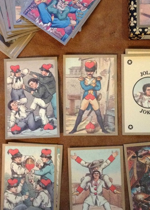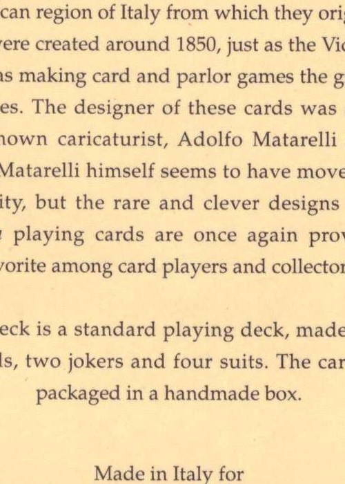These limited edition playing cards were named for the Tuscan region of Italy from which they originate.They were created 1850 just as the Victorian Age was making card and parlor games the greatest past time.The designer of these cards was then a well-known caricaturist, Adolfo Matarelli ( 1832-1877 ). Matarelli himself seems to have moved obscurity, but the rare and clever designs of his Toscana playing cards are once again providing a favorite among players and collectors. Made in Italy for Cavallini & Co. San Francisco. As it appeared in 1850, the deck comes in a lightweight wooden drop lid box, covered with hand painted paper and designed by DANIEL ONFRAY. It includes a RED WAX SEAL on lid.